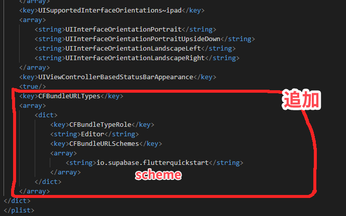 </array>io.supabase.flutterquickstartの部分はディープリンクで設定したschemeです。